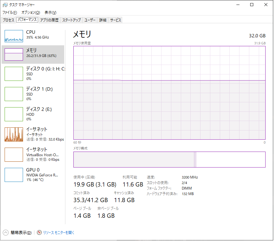 俺氏のPC、32GBのメモリーを積んでるんですが。ごらんください。20GBは軽く使用率超えてます。