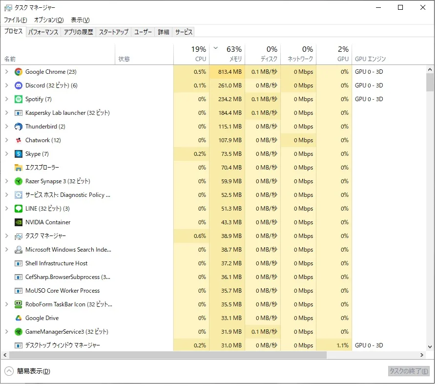 つか、なにか1個のソフトウェアに専有されてるわけではないけど、たぶん俺氏のPC、えげつないほどいろいろ後ろで動いてるんやろな(汗) Chrome閉じたところで、この使用率は対して変わらん。