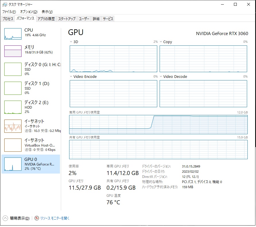わかりますかね、この負荷。GPUほぼ使ってないけど、VRAMをMAXまで食ってて、温度が70度超えてる。 リリース当初から、VRAMを喰うことは言われてましたが。無印3060なので、なんとかメモリーは足りてたみたいです。