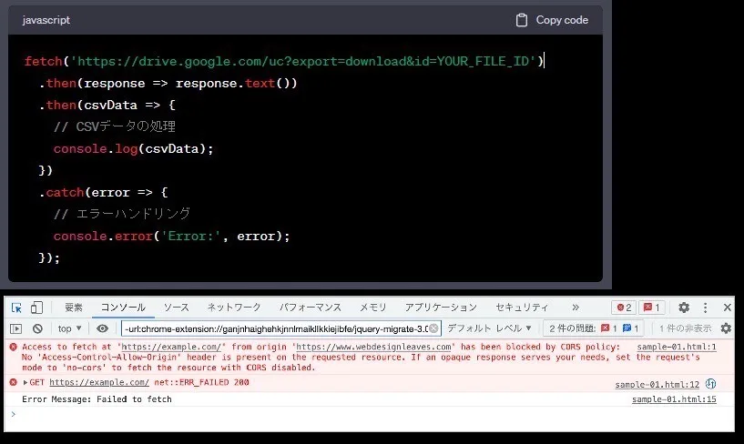 ということで、自前のサーバーにファイルをおいて、 fetch で GET しに行くんだけど、エラー。