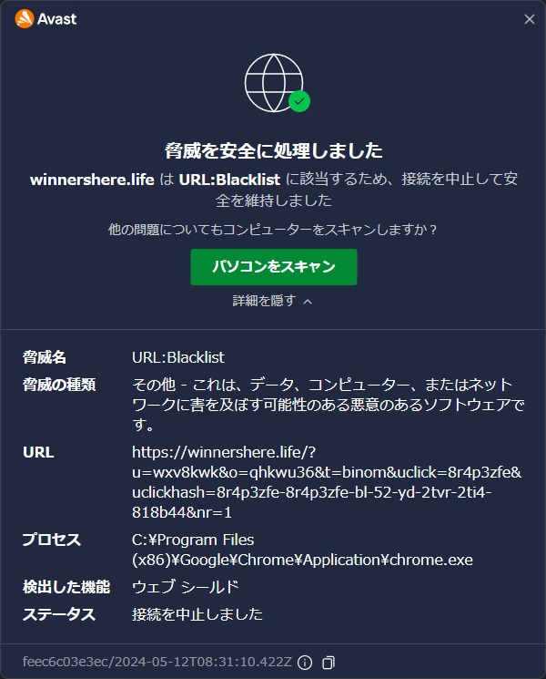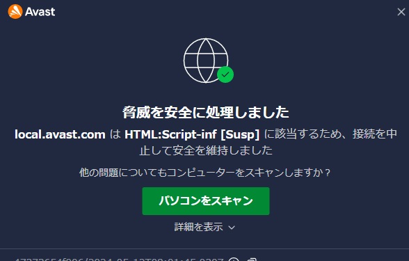 そのサイトにアクセスすると、警告画面でウィルスチェックがかりました。